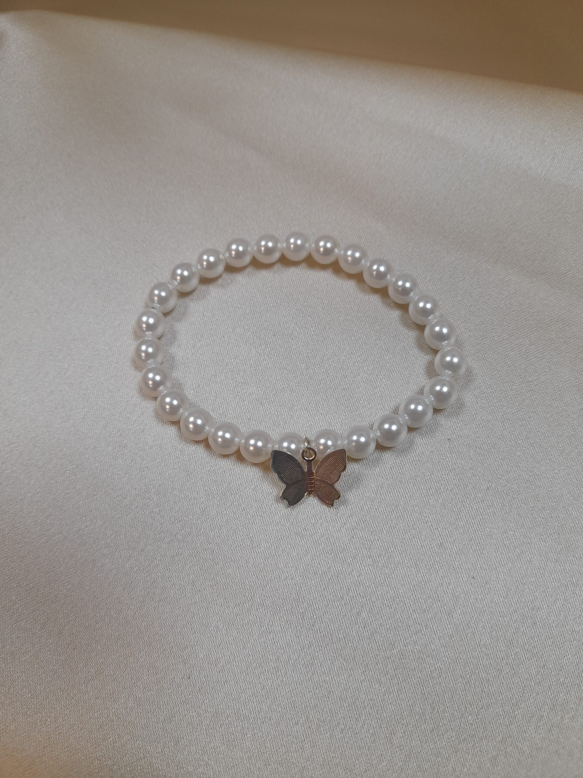 Delicate handcrafter bracelet, made up of pearls and decorated with a silver Butterfly, perfect for your bridesmaids or flower girls.